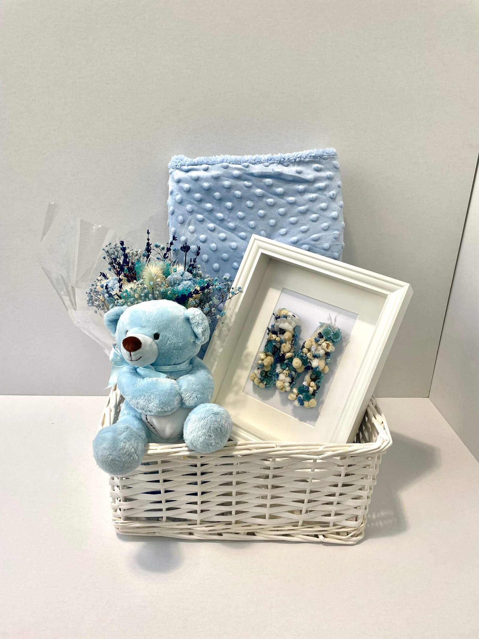 Dentro de esta encantadora canastilla de bebé azul encontrarás una manta, un cuadro de flores secas con la inicial del bebé (bajo encargo con dos días de antelación), una útil y practica cesta y además un ramo de flores secas para que mamá recuerde ese día y lo pueda poner para decorar cualquier rincón de casa.